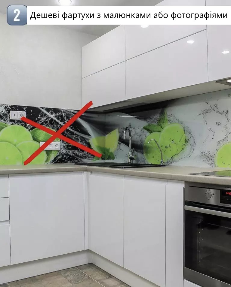 Не секрет, що фартух відіграє величезну роль в кінцевому вигляді кухні. Не використовуйте дешеві скіналі з примітивними малюнками. Краще використовувати керамічну плитку або стінові панелі. Повірте, це не дорого, а виглядає значно краще.