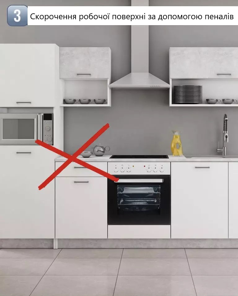 Сто разів подумайте, перш ніж скоротити місце, де ви готуєте. Іноді просять зробити міні-кухню, але обов'язково два пенали, один під холодильник, а інший під духовку та мікрохвильовку. Це велика помилка. Нормальний розмір робочої зони від 70 см і вище.