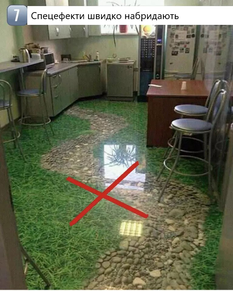 Подивіться на цей приклад. (Фото) Так, перший раз це ефект "вау". А уявіть собі, що це потрібно бачити щодня ?. Вам набриднуть ці спецефекти через місяць і ви захочете змін. Такі рішення вважаються цілковитою відсутністю будь-якого смаку. Тому за я за більш стримані рішення.