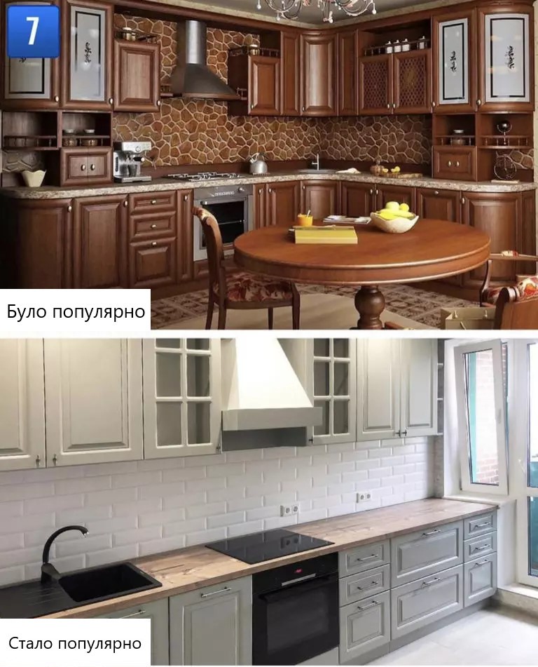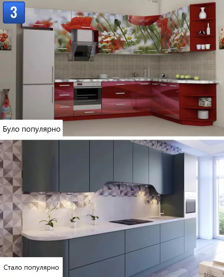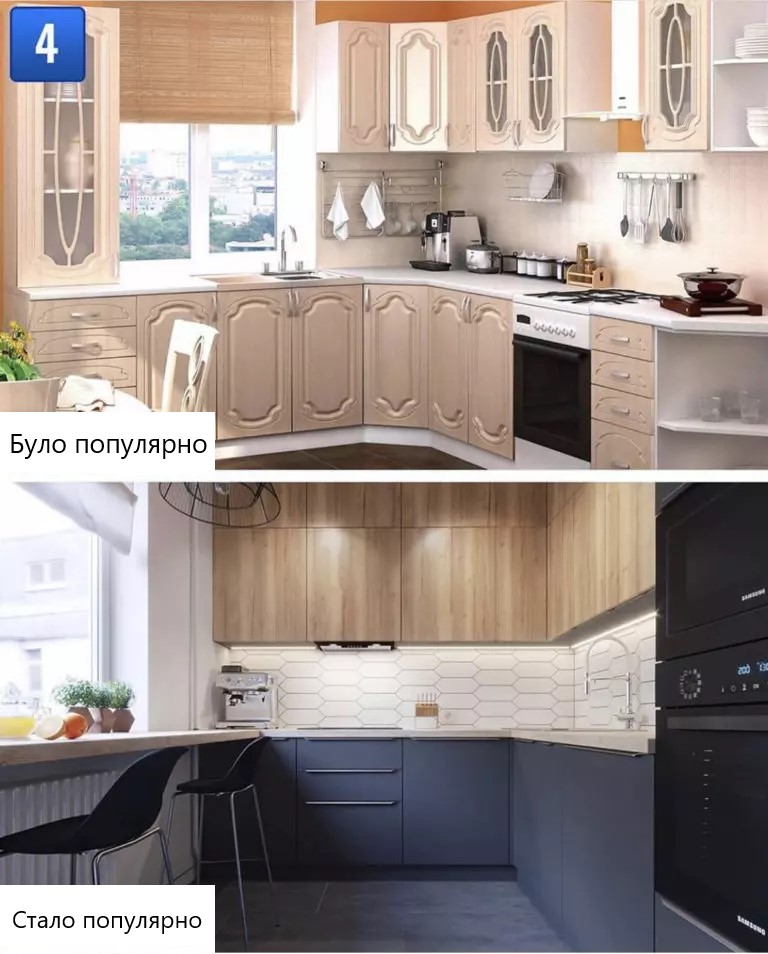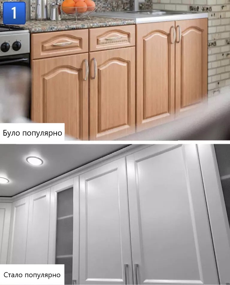 Отже, популярність фасадів з фігурним фрезеруванням зникла. Вони з'явилися ще в 90-х роках, коли на наш ринок ринув потік польських кухонь. Дивіться приклад на фото №1. Чи всі пам'ятають цей веселий час? На зміну їм прийшли фасади з більш прямими та стриманими лініями. Хоча деякі великі виробники модульних кухонь в економ-сегменті, досі випускають подібні колекції.