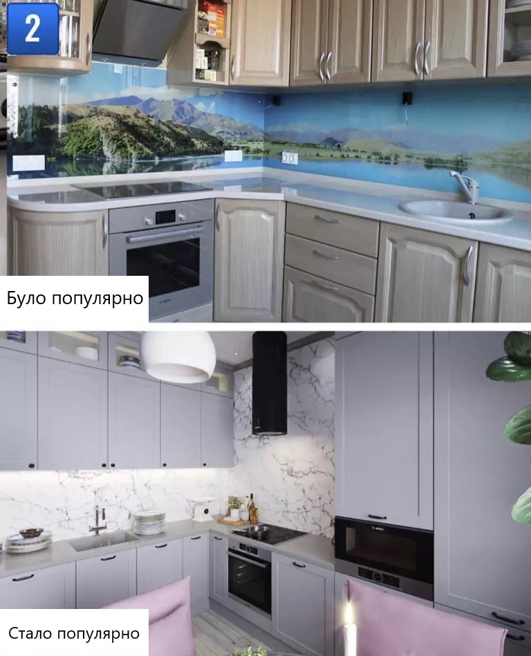 Дизайн фартуха став більш стриманим і лаконічним. Раніше популярними були стінові панелі з пейзажами, натюрмортами, фотографіями міст, тощо. Зараз в трендах керамічна плитка, панелі під дерево, камінь, бетон або однотонні кольори.